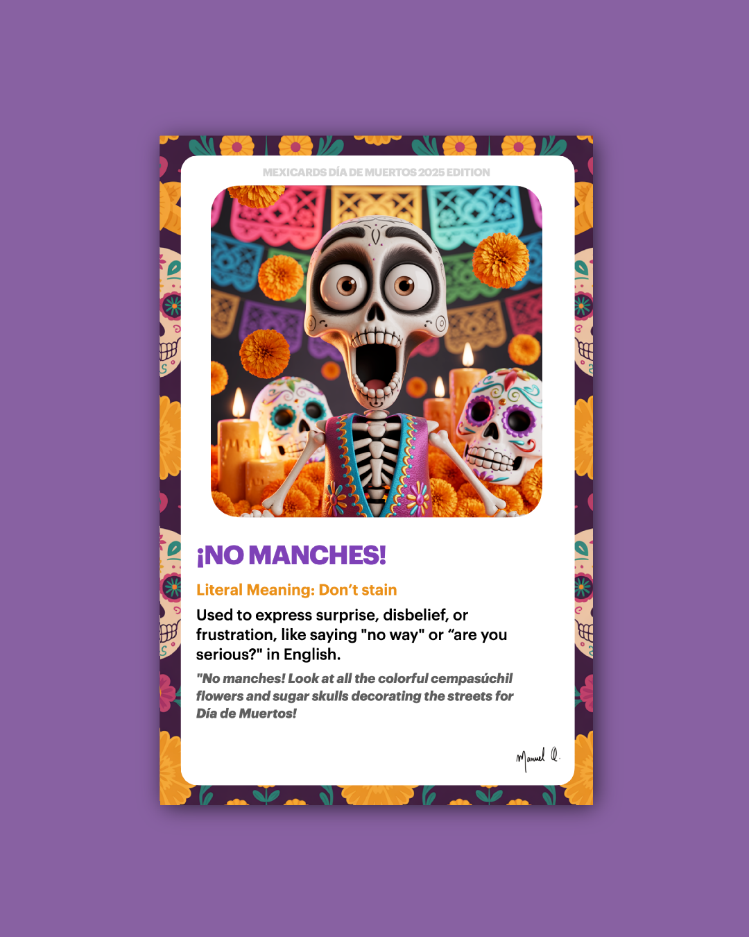 Inside this special volume, you’ll find 25 reimagined cards featuring the most beloved Mexican phrases (including some fan favorites from past volumes!) brought to life with vibrant Día de Muertos art — cempasúchil flowers, papel picado, candles, and colorful calaveras that honor the beauty of our culture.